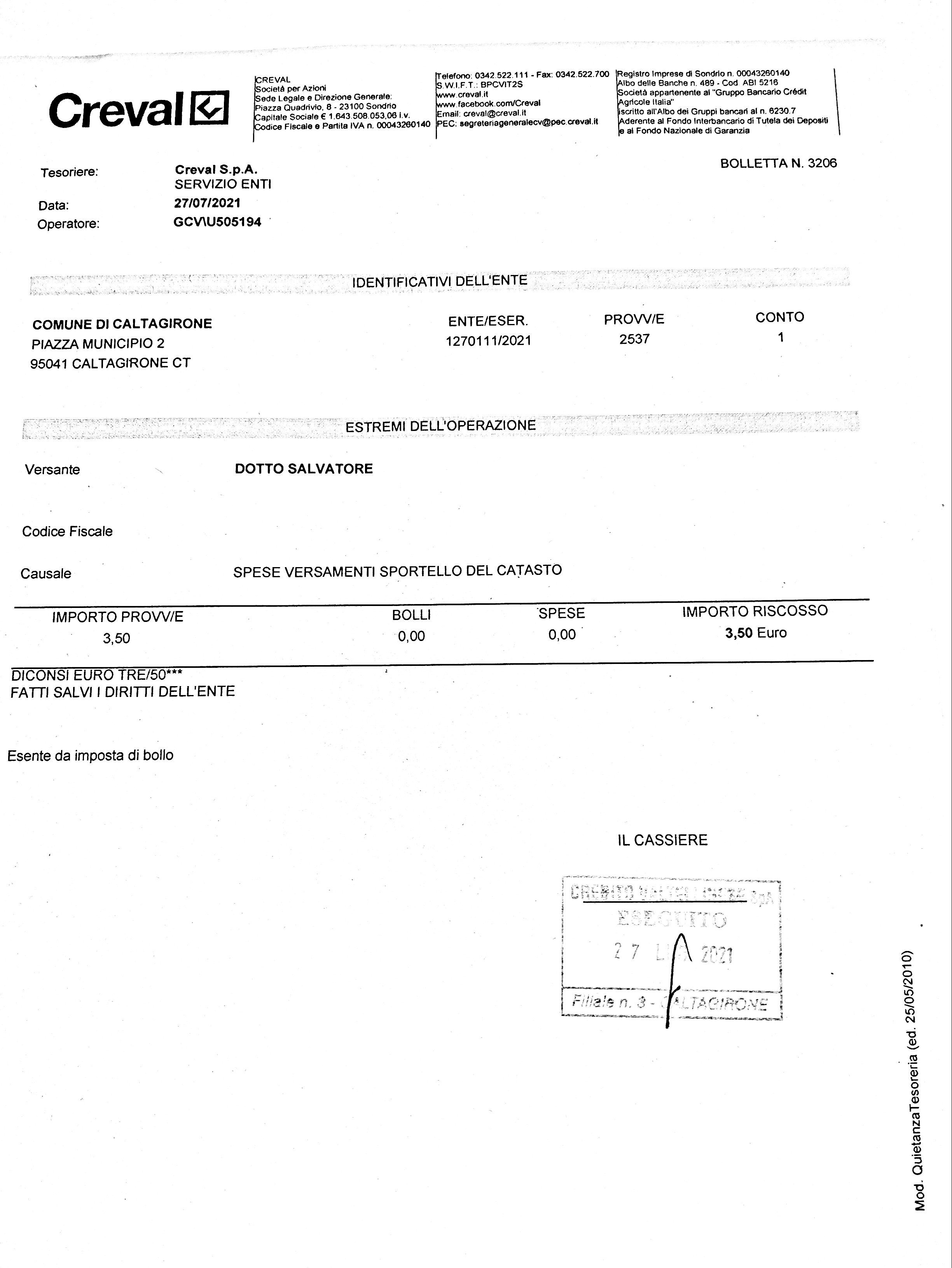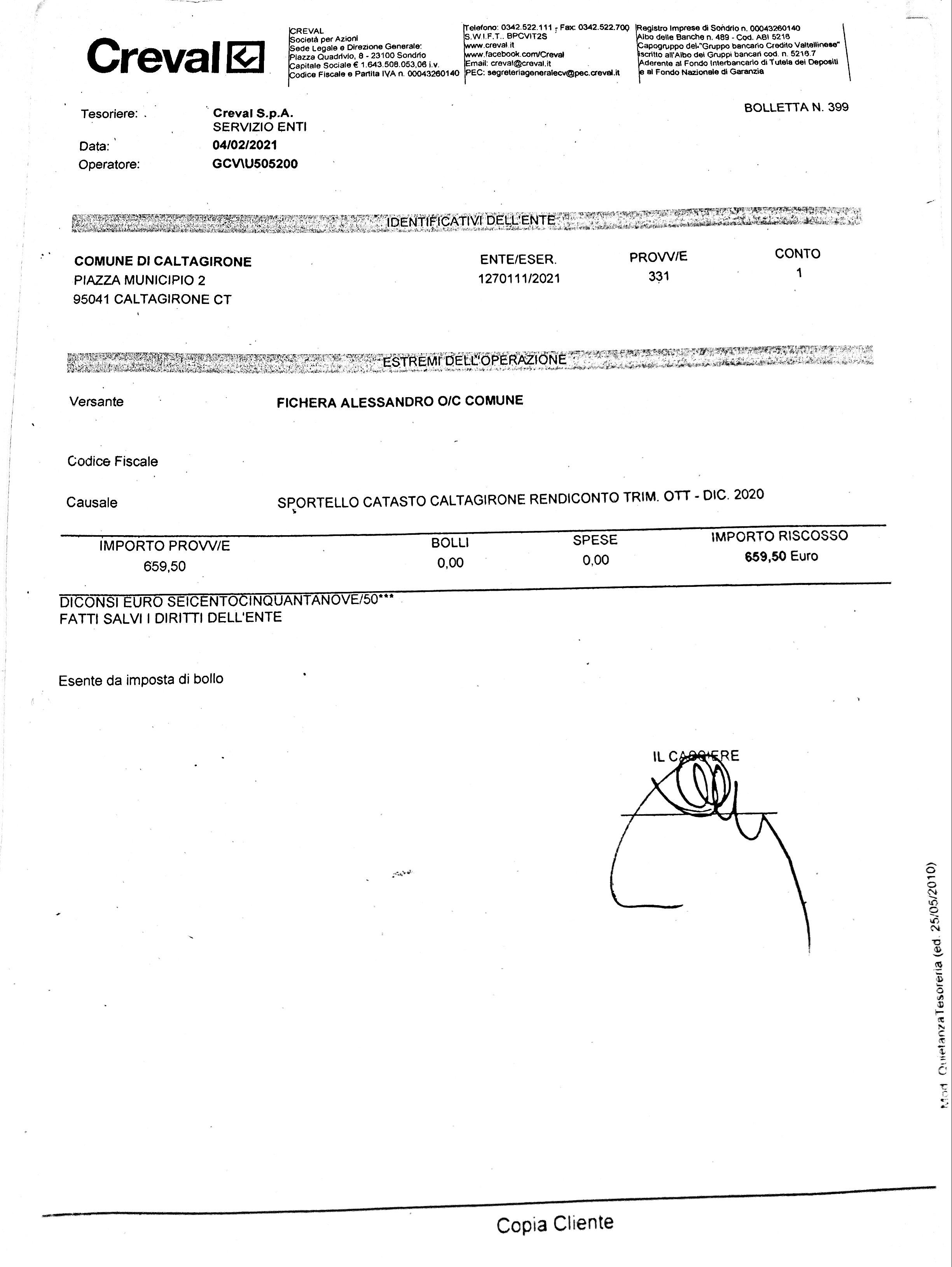 | Oggetto | Accertamento delle entrate relative ai tributi speciali catastali. Mesi ottobre-novembre-dicembre 2020 sul capitolo 33500 - Diritti di segreteria |