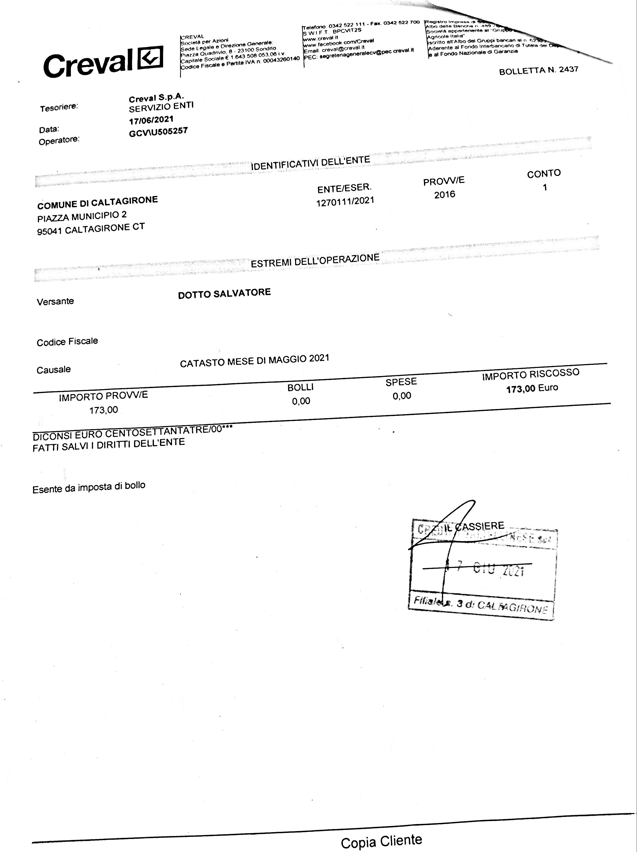| Oggetto | ACCERTAMENTO DELLE ENTRATE RELATIVE AI TRIBUTI SPECIALI CATASTALI APRILE-GIUGNO 2021 SUL CAPITOLO 335 00 - DIRITTI DI SEGRETERIA. ACCERTAMENTO SUL CAP. 370 00 ED IMPEGNO SOMME SUL CAP. 644 00 DA VERSARE ALL'AGENZIA DELLE ENTRATE TRIMESTRE APRILE-GIUGNO 2021 |