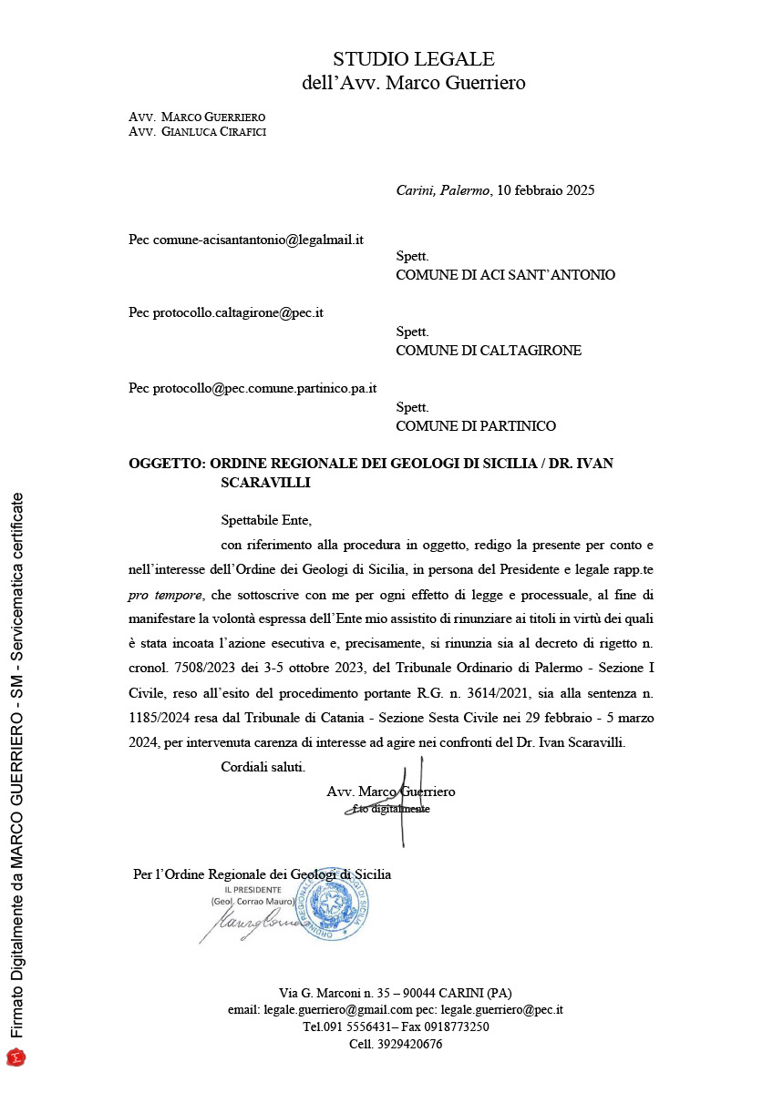 | Oggetto | Progetto di "Recupero e riqualificazione di aree degradate dei Comuni del Calatino" - Miglioramento della qualita' del decoro urbano e rifunzionalizzazione eco sostenibile dell'area UNESCO quartiere Matrice e Sant'Agostino, finanziato nell'ambito del Piano Nazionale di Ripresa e Resilienza - Articolo 21 del decreto-legge 6 novembre 2021 n. 152 - Missione 5 - componente 2 - investimento/subinvestimento 2.2 - CUP B23D22000190001 - LOTTO GEOGRAFICO 6 MESSINA-CATANIA-PALERMO - SUBLOTTO PRESTAZIONALE 3 LAVORI - CLUSTER Q1 MESSINA-CATANIA-PALERMO -Liquidazione saldo per verifica stato di dissesto idrogeologico, indagini geognostiche e prove di laboratorio Dott. Scaravilli. CIG 9632266D59. |